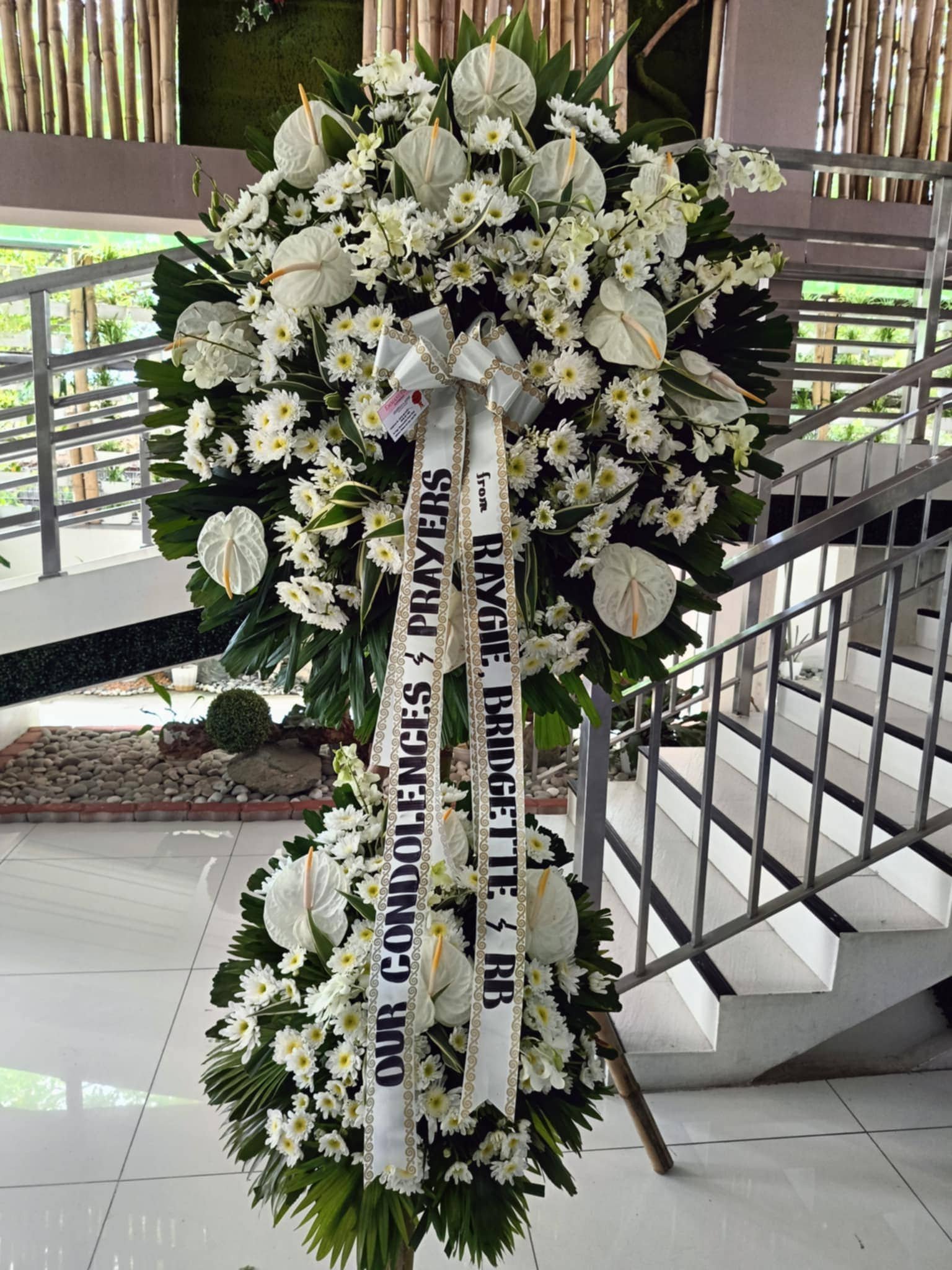 Our gorgeous Red and White floor arrangement features the freshest red roses, white spider mums, white gladiolas, red carnations and more. Send an expression of your love and concern at this difficult time.Our florist's hand-design each arrangement, so colors, varieties, and containers may vary due to local availability.
